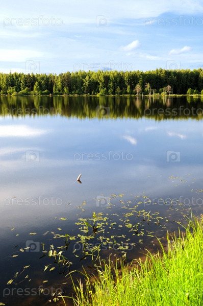 Зеленые деревья у озера в солнечный день, с облаками на небе