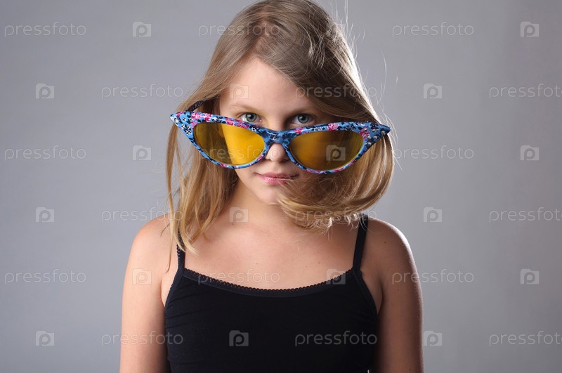 Маленькая девочка в больших смешных очках в студии