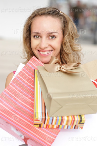 Улыбающаяся девушка с покупками в торговом центре
