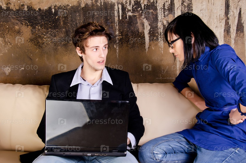 Молодой человек с ноутбуком и его недовольная подруга