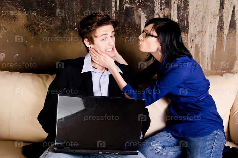 Молодой человек с ноутбуком и его недовольная подруга