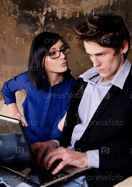 Молодой человек с ноутбуком и его недовольная подруга
