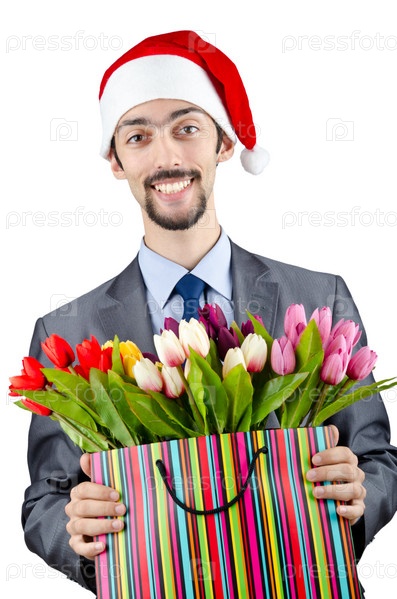 Бизнесмен в рождественской шапке с тюльпанами в руках