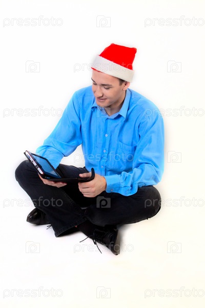 Мужчина в колпаке Санта-Клауса с электронной книгой в руках