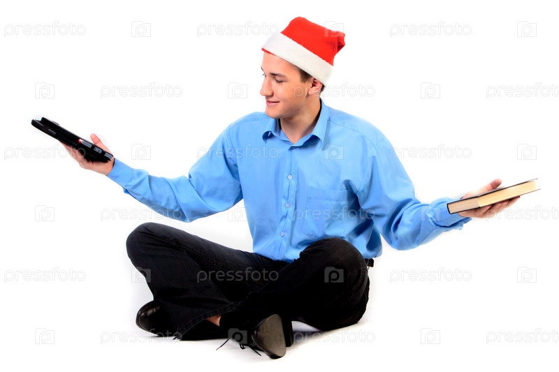 Мужчина в колпаке Санта-Клауса с бумажной и электронной книгой в руках