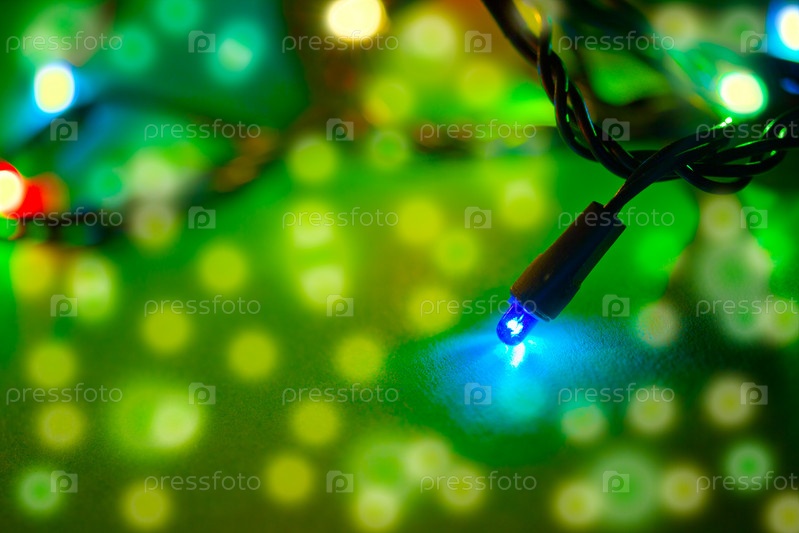 Новогодние разноцветные огни на зеленом фоне