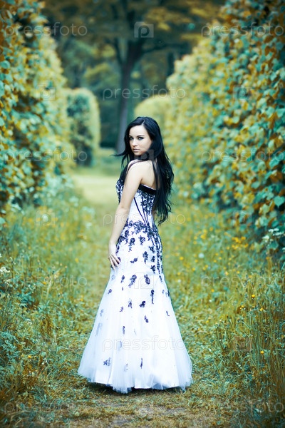 Красивая молодая женщина в элегантной одежде в драматическом волшебном парке