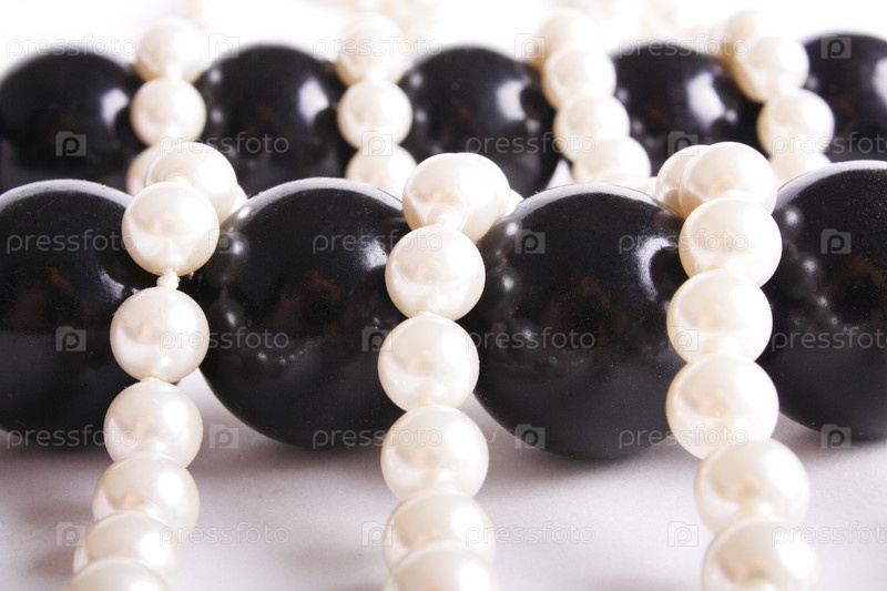 Жемчужины и черные бусы на холсте (ближе)