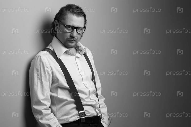 Мужчина в очках на сером фоне у стены
