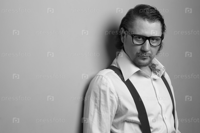 Мужчина в очках стоит у стены