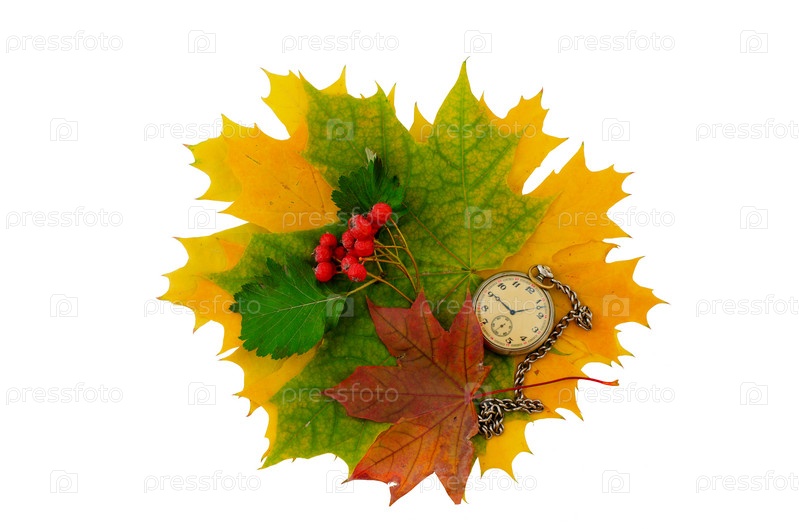 Старые карманные часы и рябина на фоне листьев