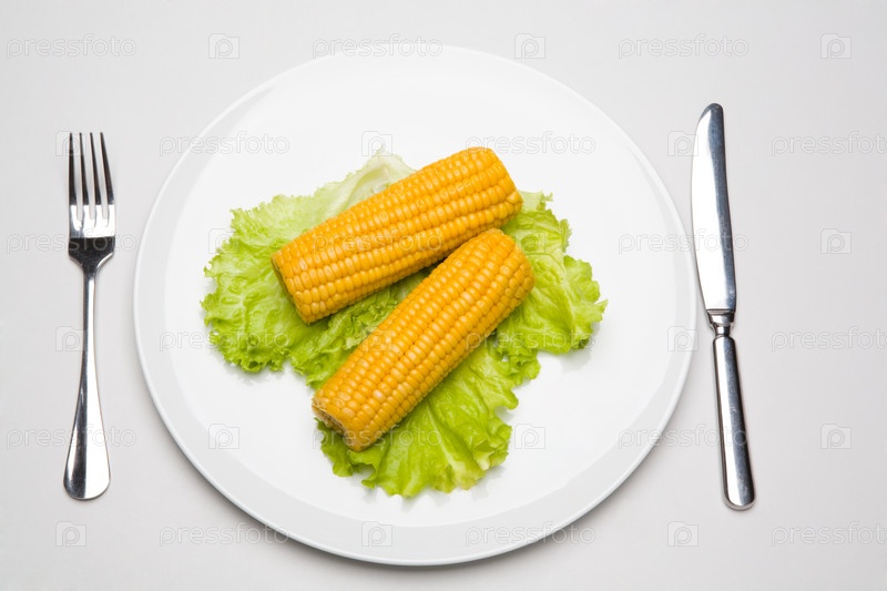Два кукурузных колоса помещены на тарелку с вилкой и ножом рядом