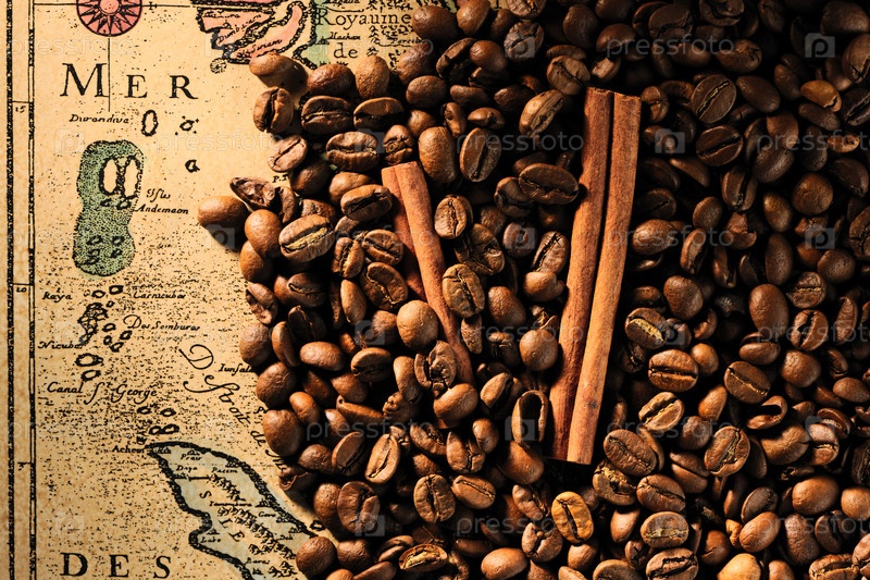 Кофейные зерна и палочки корицы на старой карте