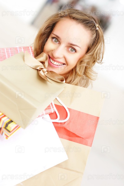 Молодая симпатичная женщина с пакетами в торговом центре