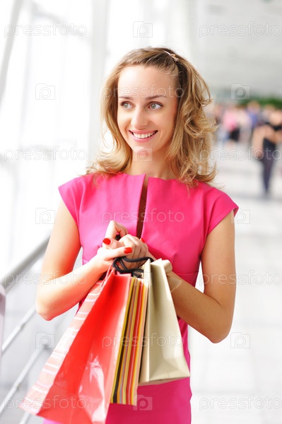 Молодая симпатичная женщина с пакетами в торговом центре