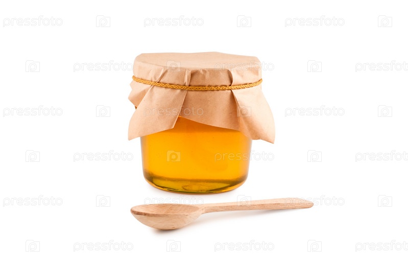 Мед с деревянной ложкой на белом фоне