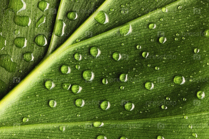 Капли воды на зеленом листе крупным планом