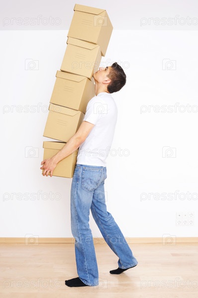 Молодой человек,несущий кучу коробок