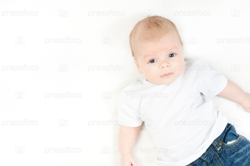 Маленький ребенок лежит на белом и смотрит в камеру