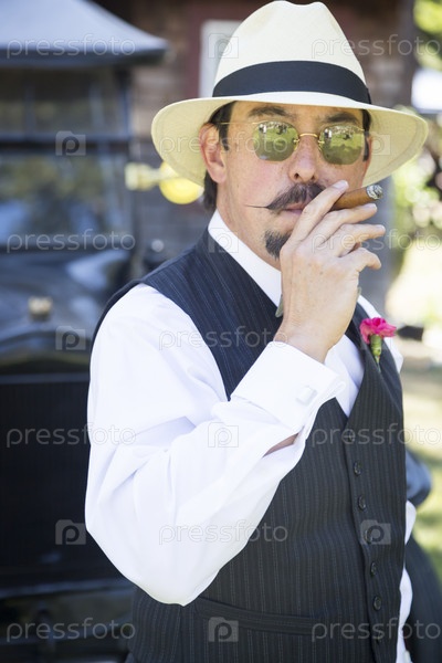 Мужчина, одетый в стиле 1920-х годов, курит сигару