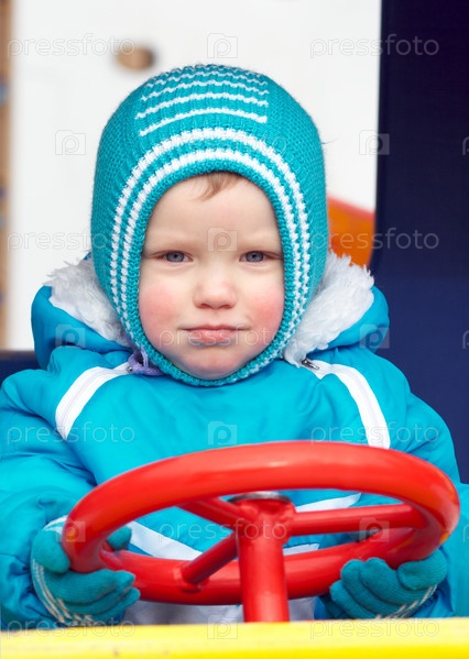 Маленький мальчик в игрушечной машине на детской площадке