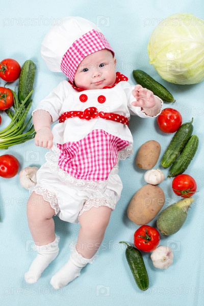 Ребенок шеф-повар со свежими овощами