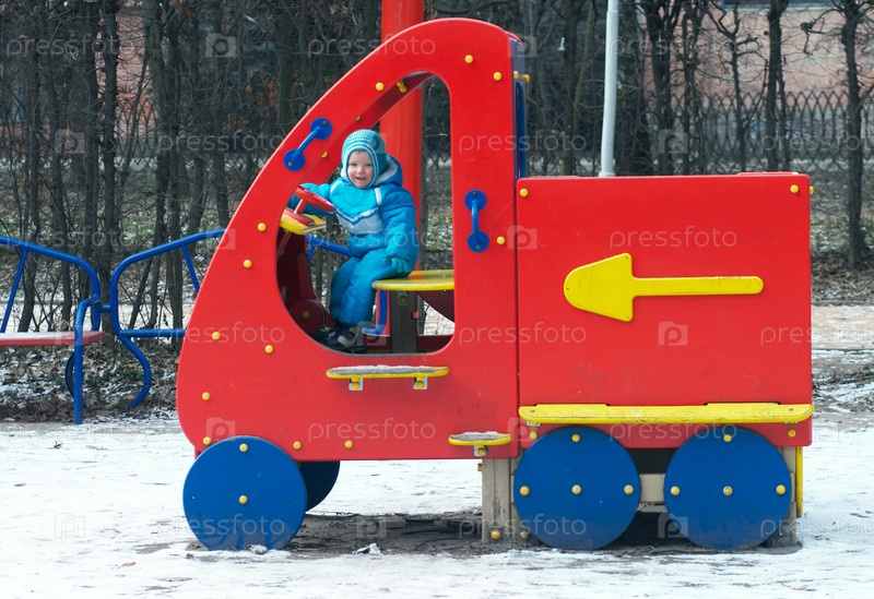Маленький мальчик в игрушечной машине на детской площадке