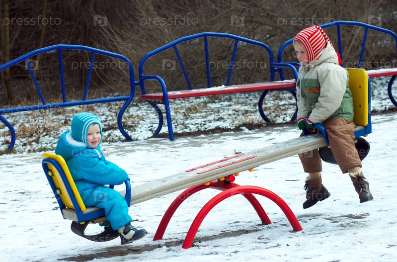 Сестра и брат качаются на качели на детской площадке