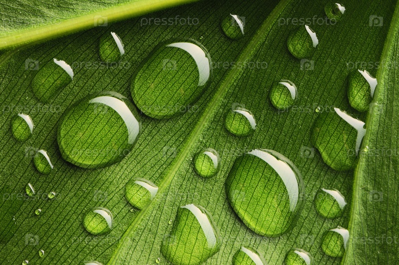 Капли воды на листочке крупным планом