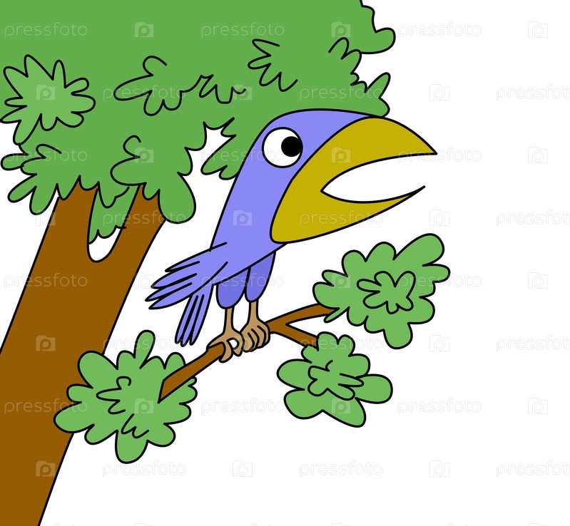 Птица на дереве, на белом фоне