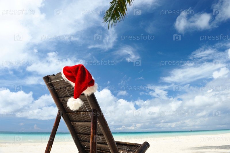 Шляпа Санты и шезлонг на пляже