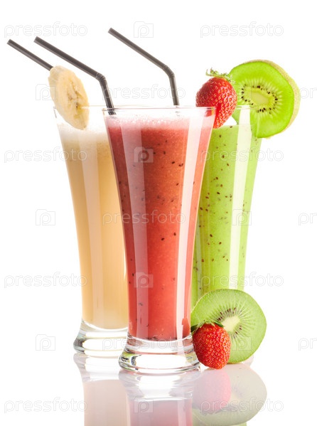 Фруктовые коктейли на белом фоне - клубника, киви, банан
