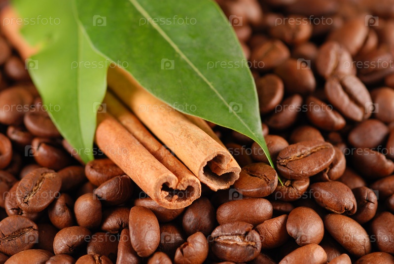 Кофейные зерна и корица с листьями