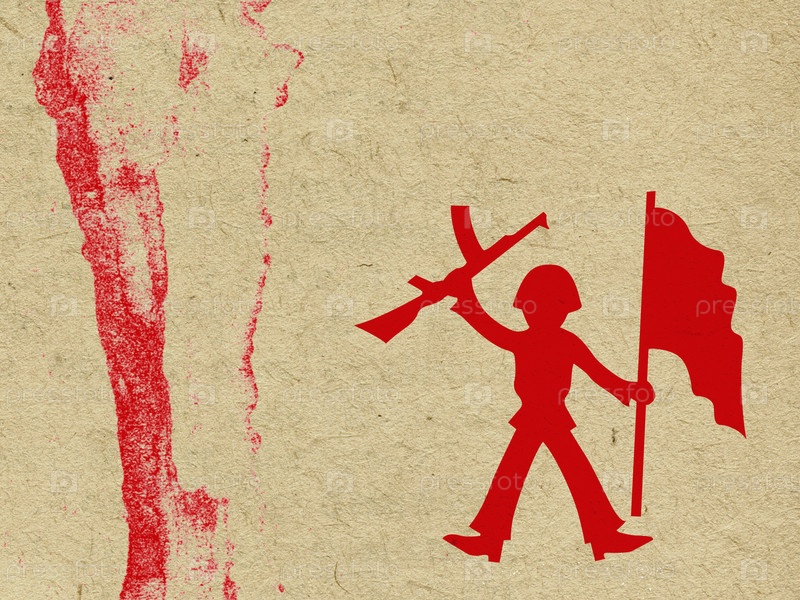 Красный солдат с флагом и автоматом на фоне гранж