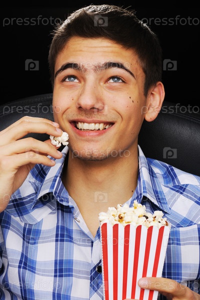 Молодой человек, смотрит фильм в кинотеатре