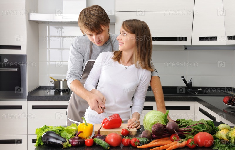 Пара, готовит пищу на современной кухне