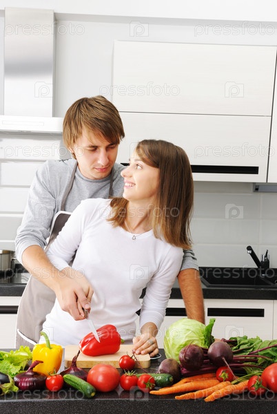 Пара, готовит пищу на современной кухне