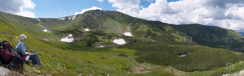 Женщина сидит на склоне, глядя на можжевеловые леса Карпатских гор, Украина