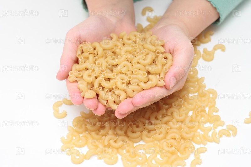 Много макарон в детских руках на белом фоне