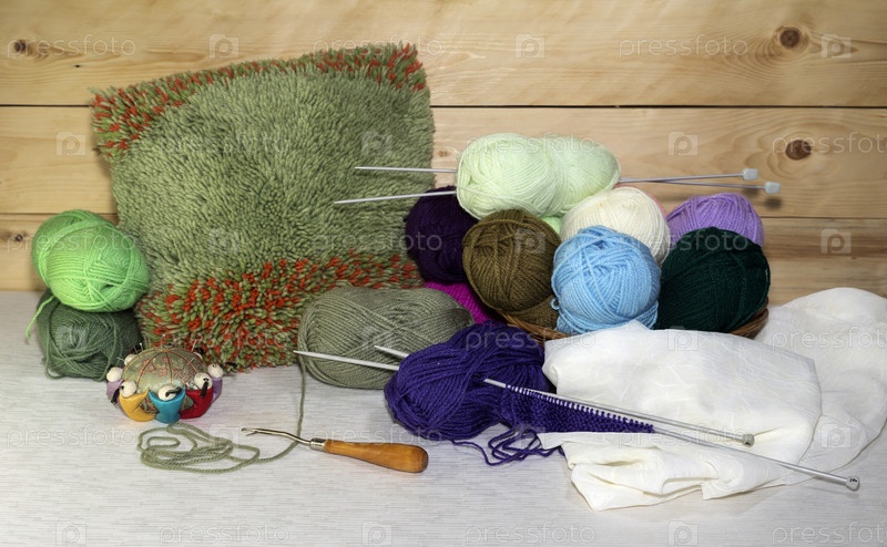 Мотки ниток и вязальные принадлежности