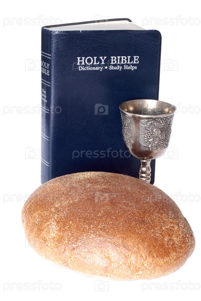 Библия, хлеб и вино на белом