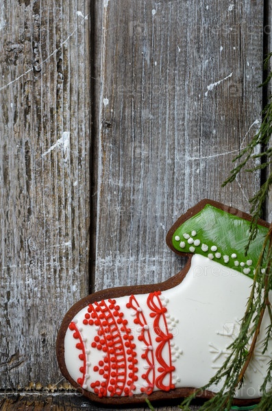 На фоне деревянные сапоги рождественские пряники