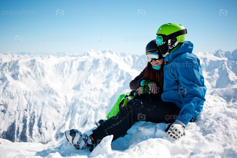 Молодая пара счастлива в снежных горах