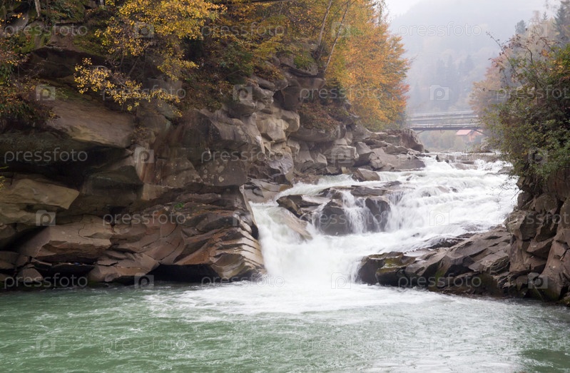 Пороги на горной реке в осенних Карпатских горах, Украина