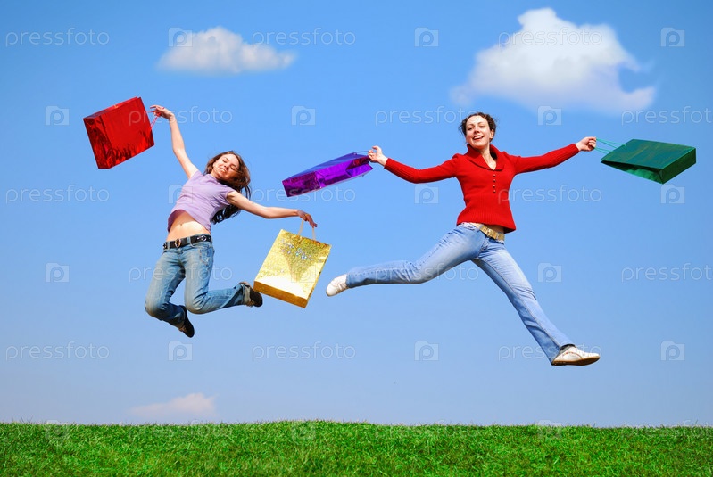 Девушки с яркими пакетами прыгают на открытом воздухе