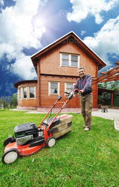 Мужчина стрижет газон