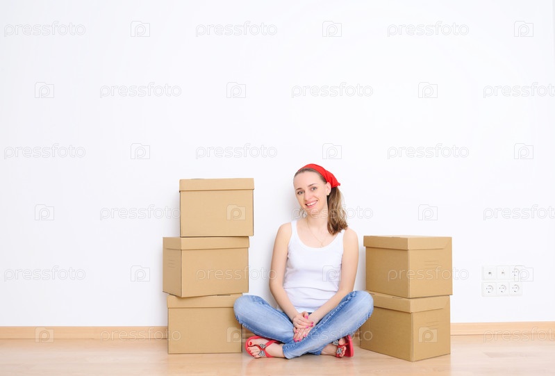 Молодая женщина отдыхает от переезда в новый дом