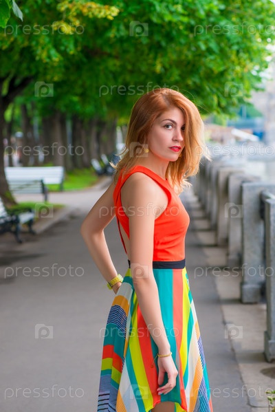 Молодая красивая девушка ходит на набережной в яркое платье