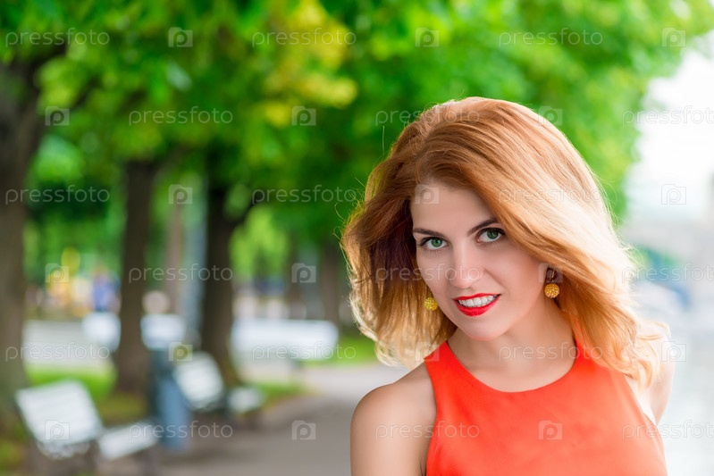 Гламур девушки сталкиваются с красными губами в парке