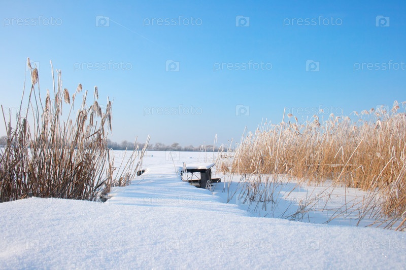 Деревянный мост на озере под декабрьским снегом